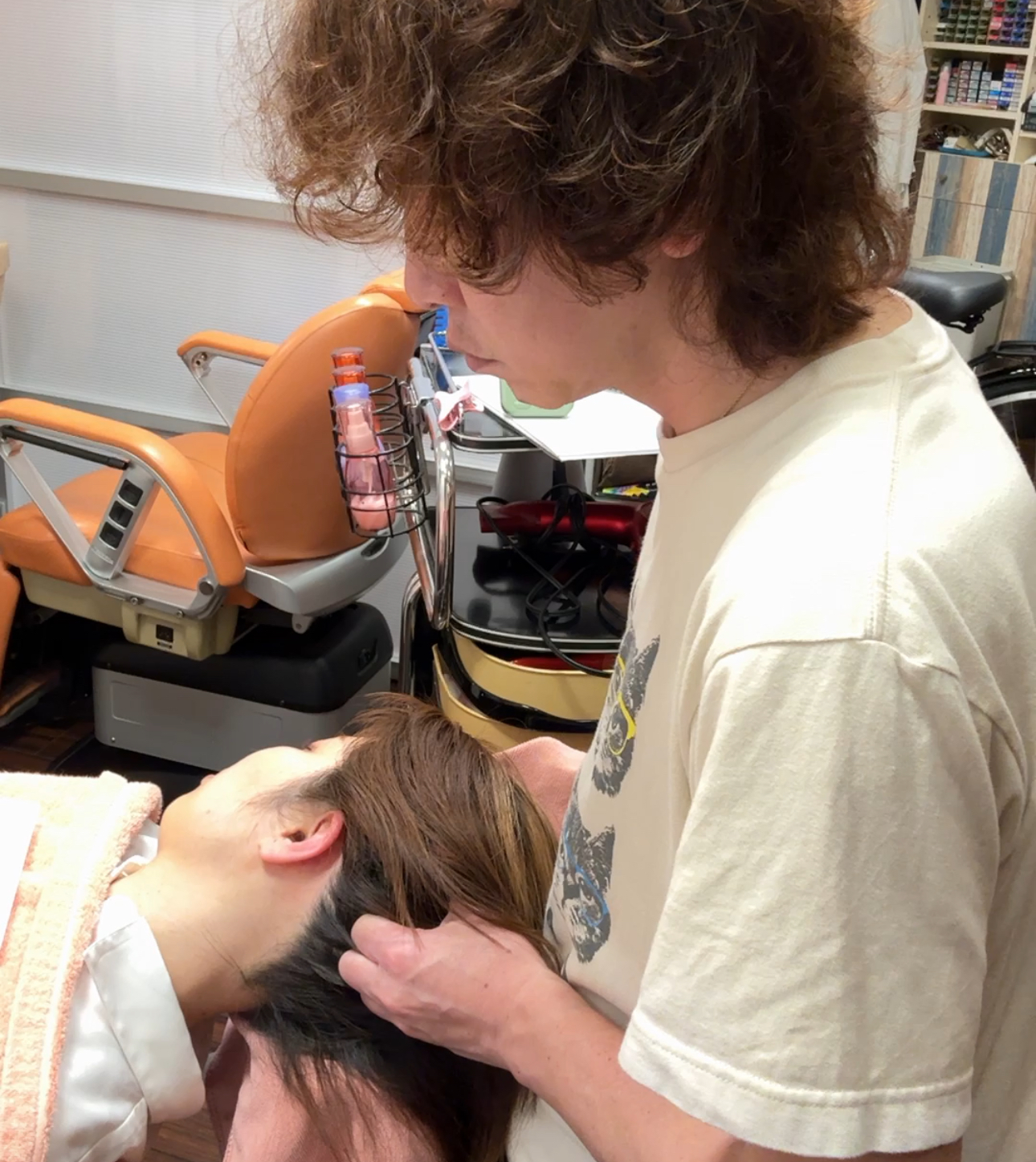 座ったまま頭の凝りをほぐします。させて頂く前に2つの種類の施術の違いを簡単にご説明してから選んでいただきます。